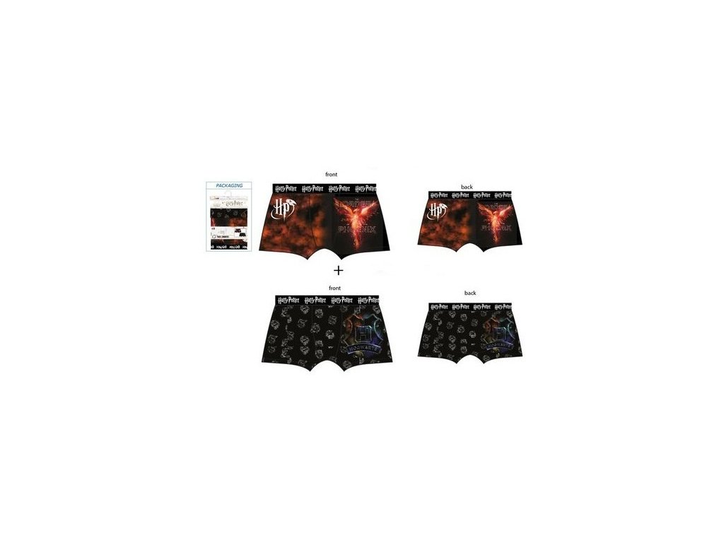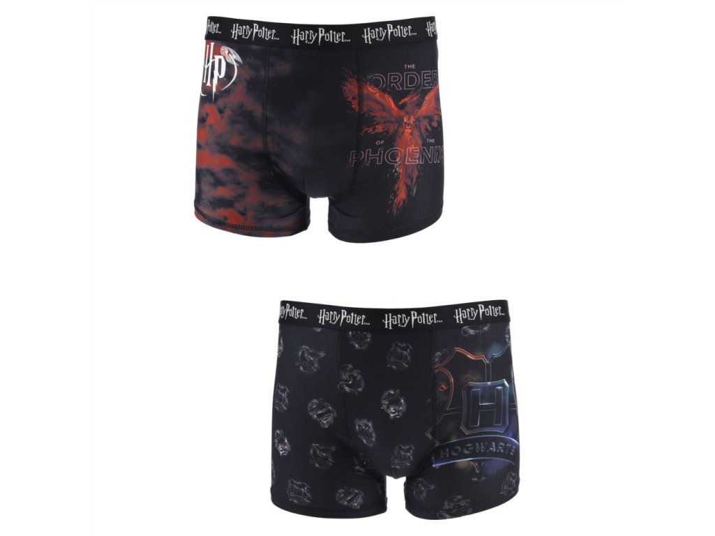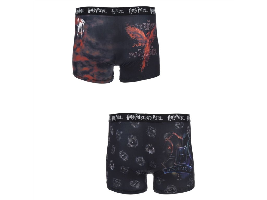 Pánský set pohodlných trenýrek. Sada obsahuje 2 kusy boxerek v tmavé barvě s motivem koleje Nebelvír.