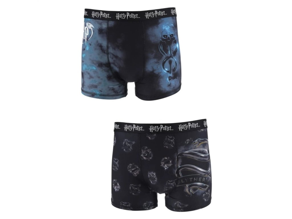 Pánský set pohodlných trenýrek. Sada obsahuje 2 kusy boxerek v tmavé barvě s motivem koleje Zmijozel.