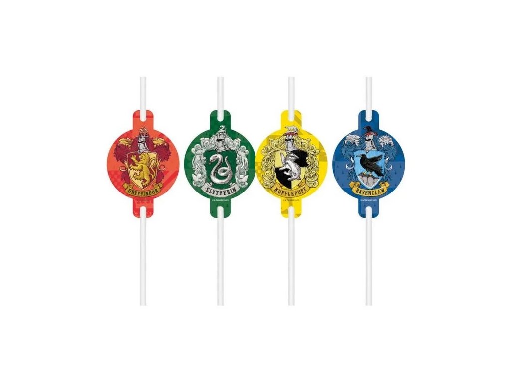 Papírová brčka s erby bradavických kolejí.