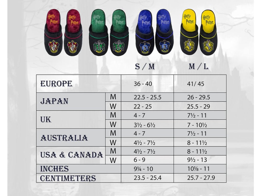S vyšitým znakem koleje jsou tyto pantofle neuvěřitelně pohodlné a měkké. Po dlouhém, chladném dni do nich stačí jen vklouznout. Tato obuv ze světa Harryho Pottera je nezbytným kouskem pro teplou a útulnou zimu. Velikost S/M odpovídá cca EUR 36-40 a velikost M/L cca EUR 41-45.