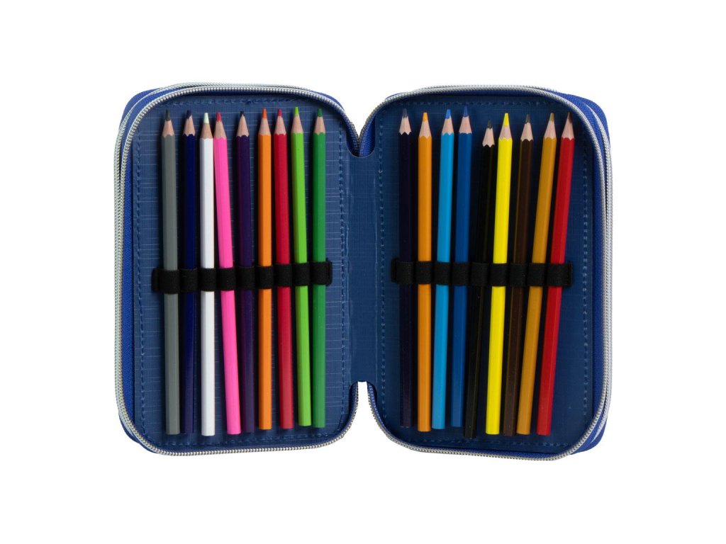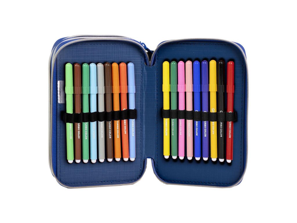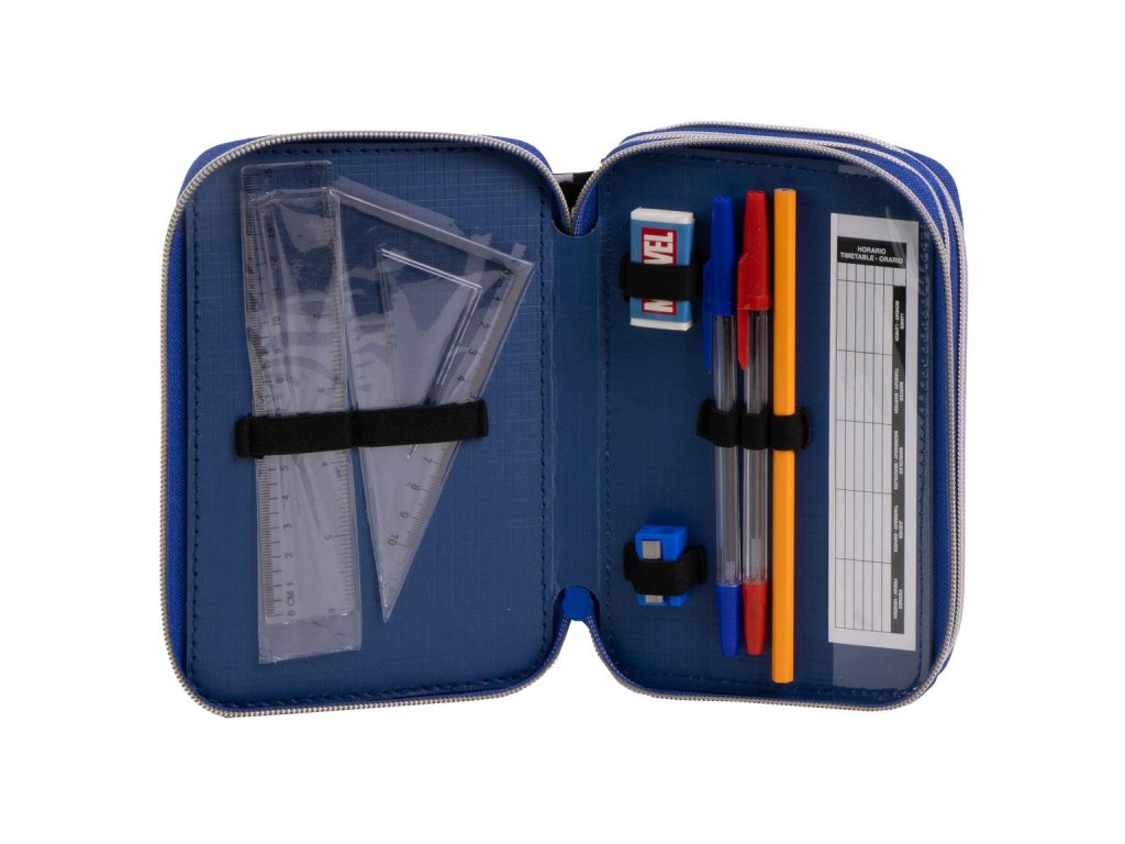 Černý třípatrový penál s motivem Avengers je ideální volbou pro všechny malé superhrdiny. Obsahuje kompletní školní vybavení – 18 pastelek, 18 fixů, červenou a modrou propisku, tužku, ořezávátko, pravítko, nůžky a gumu. Praktický a přehledný design zajistí, že všechny pomůcky budou vždy po ruce.Doplňkové parametry