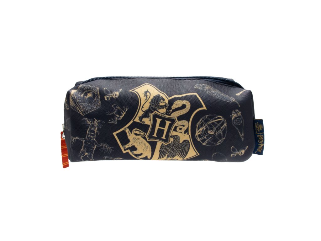 Černé pouzdro na psací a jiné potřeby. Grafický design několika symbolických předmětů, postav a nápisu Harry Potter - vše ve zlaté barvě. Nechybí ani kresba postavy člena nebelvírské koleje a mladého čaroděje Harryho Pottera.