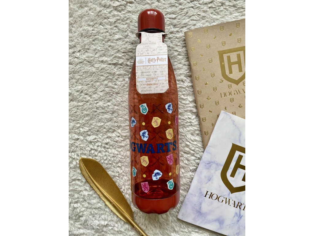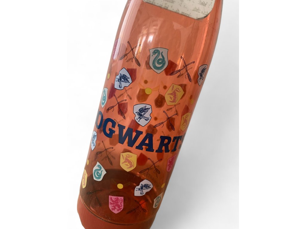 Barevná plastová lahev se znaky jednotlivých kolejí školy čar a kouzel v Bradavicích.
