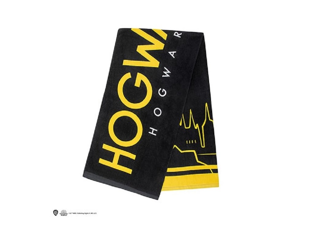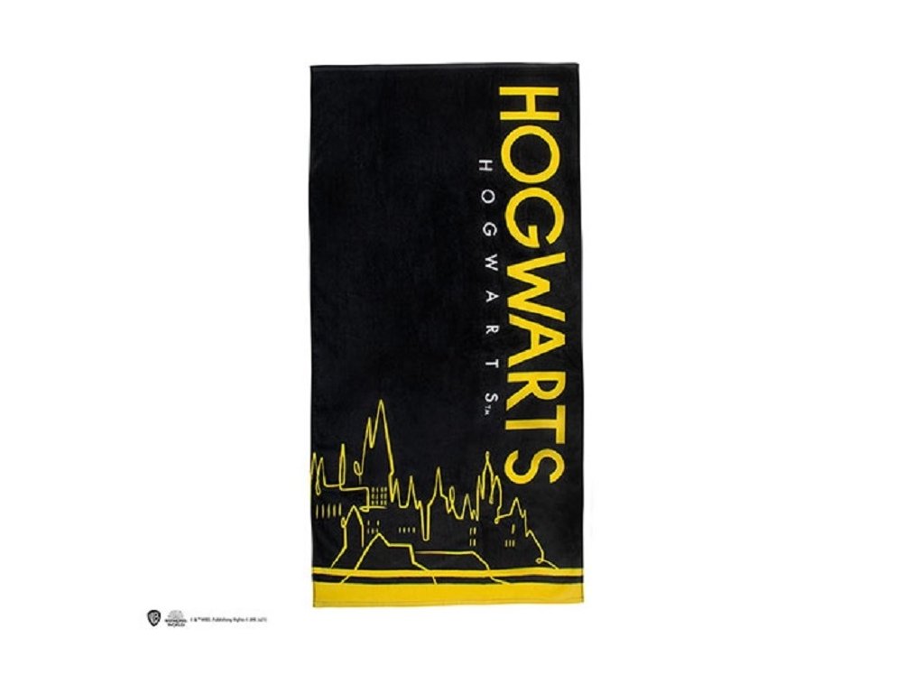 Kvalitní bavlněná plážová osuška s nápisem Hogwarts a s obrázkem hradu.
