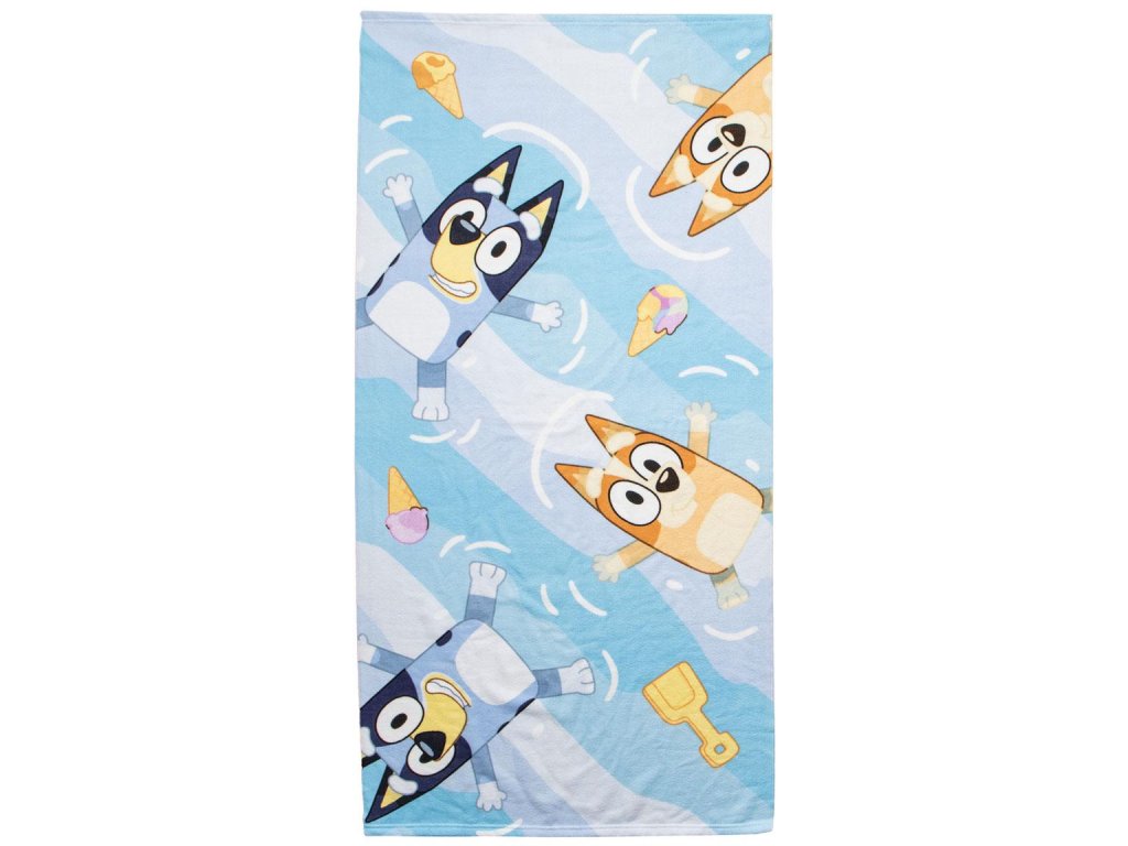 - Plážová osuška: měkký a savý materiál, velikost cca 70 × 140 cm, motiv Bluey a Bingo