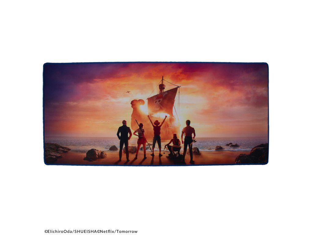 Podložka na stůl s motivem posádky Slaměného klobouku, která hledí k horizontu, zatímco slunce zapadá za jejich loď. Poskytne pevný a praktický povrch pro vaše každodenní úkoly na PC.