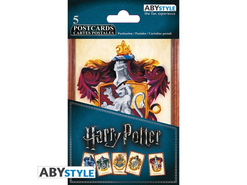 Každá pohlednice je potištěna erbem jedné z bradavických kolejí, v sadě najdete 5 kusů.