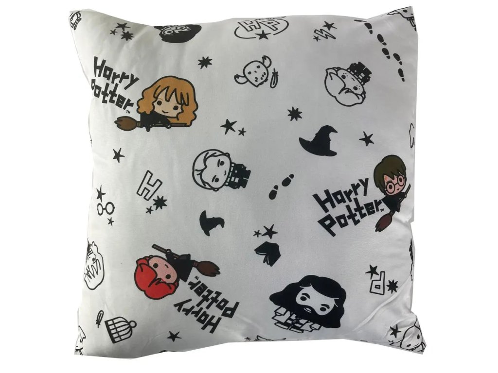 Čtveratý polštář s motivem oblíbených postav Harryho Pottera, Hermiony Grangerové a Rona Weasleyho na košťatech.