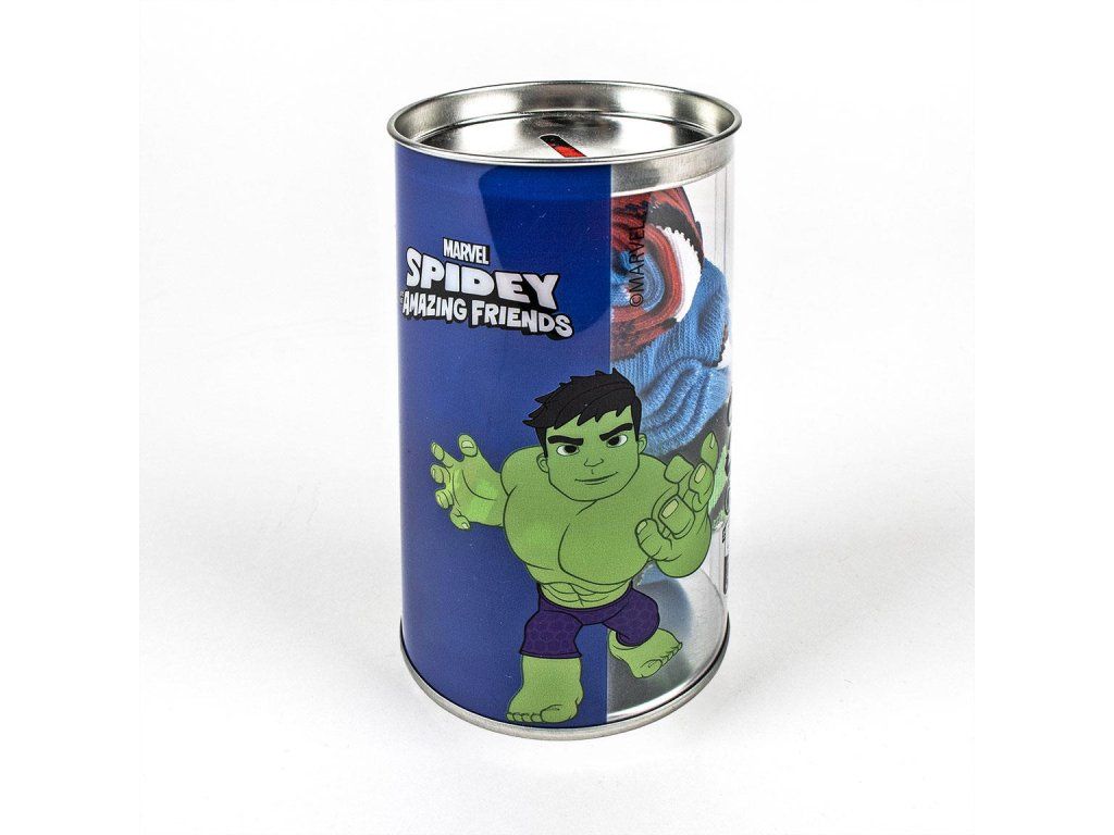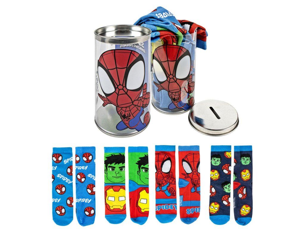 Sada čtyř párů ponožek s motivem Spideyho nabízí kombinaci pohodlí a hravého designu. Jsou vyrobeny z měkkého a prodyšného materiálu, který zajišťuje příjemné nošení po celý den. Krabička po té může sloužit jako pokladnička.