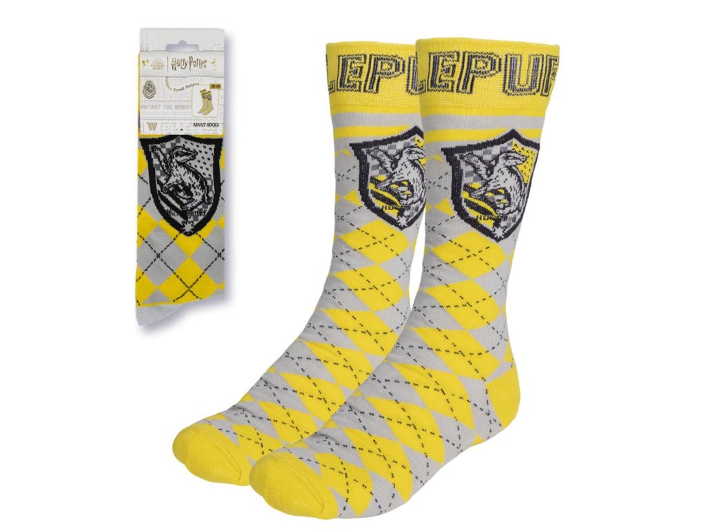Jeden pár vysoce kvalitních klasických ponožek v tematickém designu bradavické školní koleje Mrzimor. Ponožky zdobí erb a nápis dané koleje.
