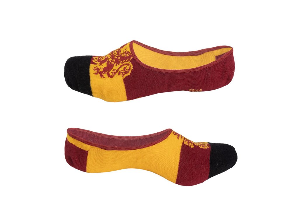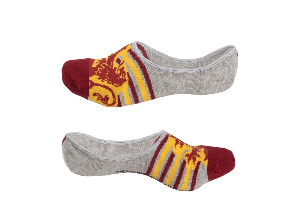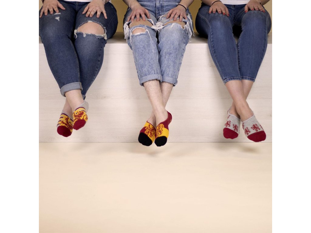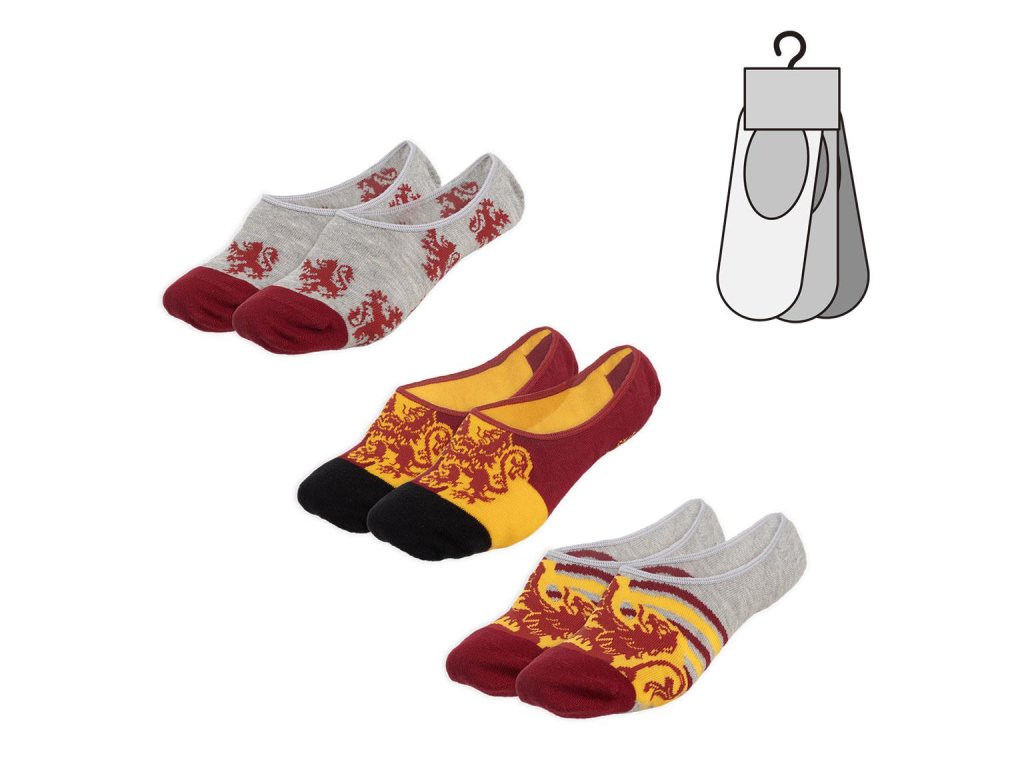 Tři páry vysoce kvalitních nízkých ponožek (slip-on) v tematickém designu bradavické školní koleje Nebelvír. Ponožky zdobí erb a nápis dané koleje.