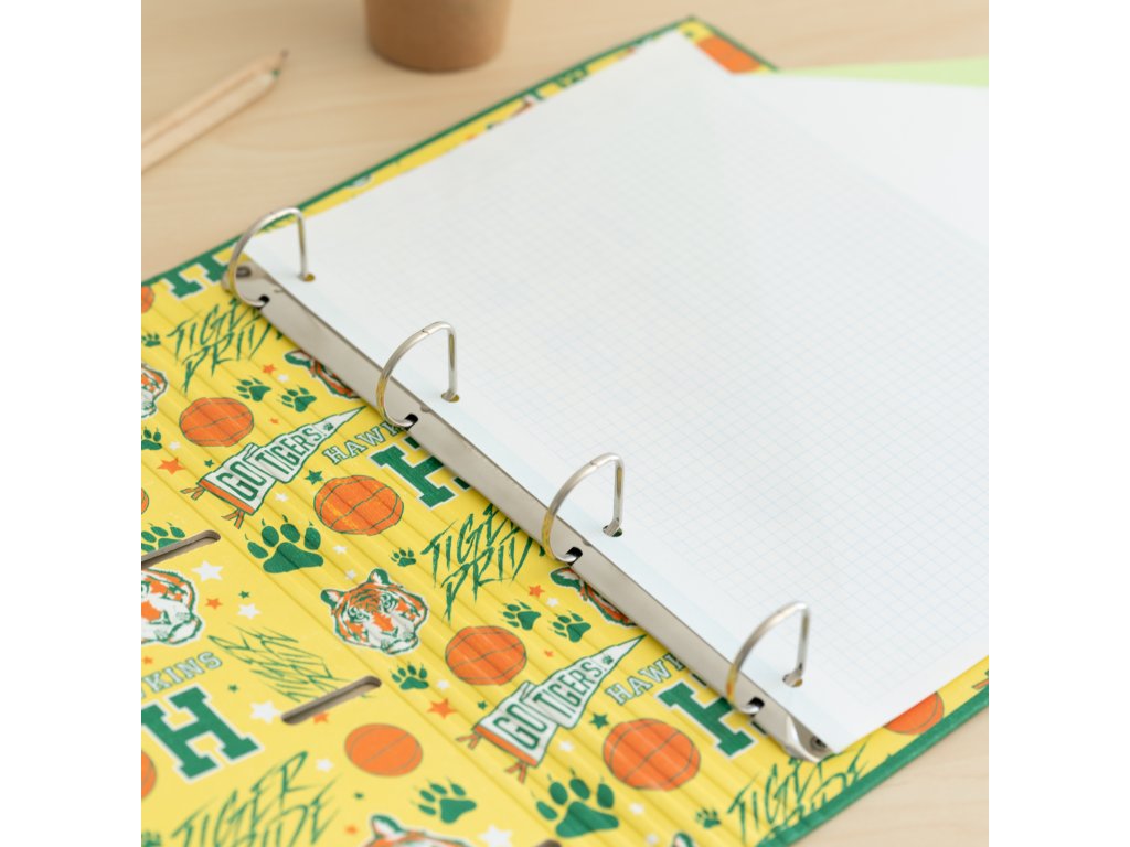 Vyrobeno z 2mm tvrdé kartonové desky s matným laminovaným papírem o gramáži 150 g/m². Rozměry 32 x 27,5 cm, včetně čtyřkroužkové vazby, 9mm gumičky a personalizovaného vnitřního designu.