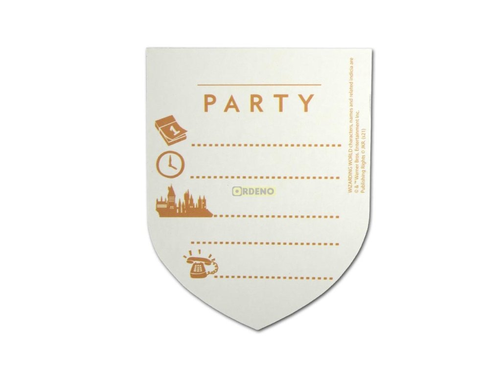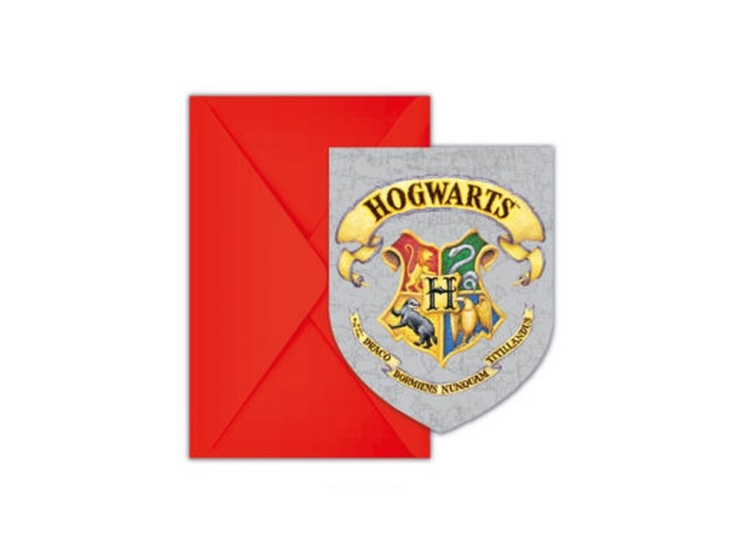 V balení najdete 6 kusů pozvánek na party s motivem bradavického znaku a 6 obálek.