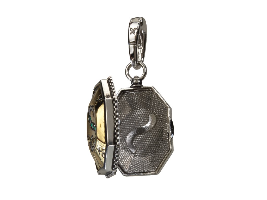 Doplňte svůj náramek Lumos tímto přívěskem ve tvaru Zmijozelova medailonu. Tento všestranný přívěsek je pokovený stříbrem a zlatem, zdobený malými zelenými drahokamy a má karabinku, a lze jej připevnit k našim náramkům Lumos s přívěsky Harry Potter nebo k vašemu vlastnímu náhrdelníku či náramku. Přívěsky měří přibližně 2–3 cm. Spona měří přibližně 4 mm napříč a 9 mm podél vnitřního průměru.Doplňkové parametry