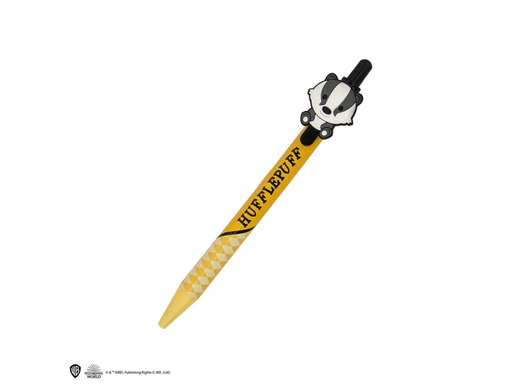 Plastová žlutá propiska s nápisem Hufflepuff a jezevcem.