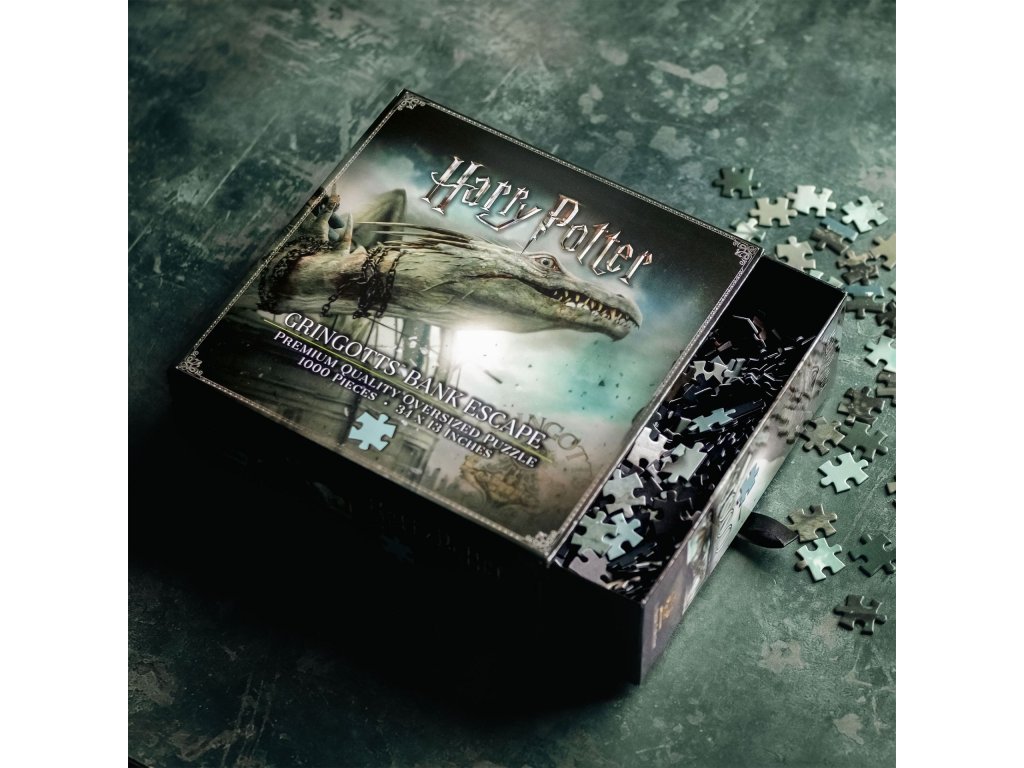 Zažijte adrenalinový útěk z nitra nejstřeženější kouzelnické banky! Toto detailně zpracované puzzle zachycuje dramatickou scénu z filmového finále, kde Harry, Hermiona a Ron prchají na zádech draka z trezoru v Gringottově bance.