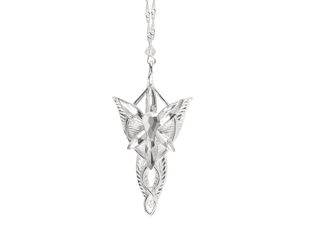 Tento působivý náhrdelník Večernice (Evenstar) je replikou šperku, který nosila Arwen v trilogii Pán prstenů. Přívěsek je proveden v elegantním stříbrném odstínu a opatřen jemnými detaily, které evokují elfskou estetiku. Zavěšen na řetízku vhodné délky, vhodný k běžnému nošení i k výstavě v kolekci fanouška Středozemě.