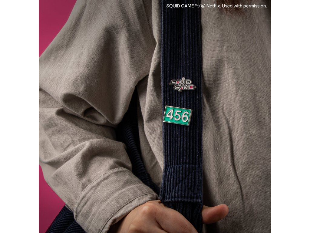 Duo výrazných odznaků hráče 456 a logo Squid Game. Každý odznak připomíná dobrodružství 456 hráčů, zejména hlavního hrdiny Seong Gi-huna, známého jako hráč 456.