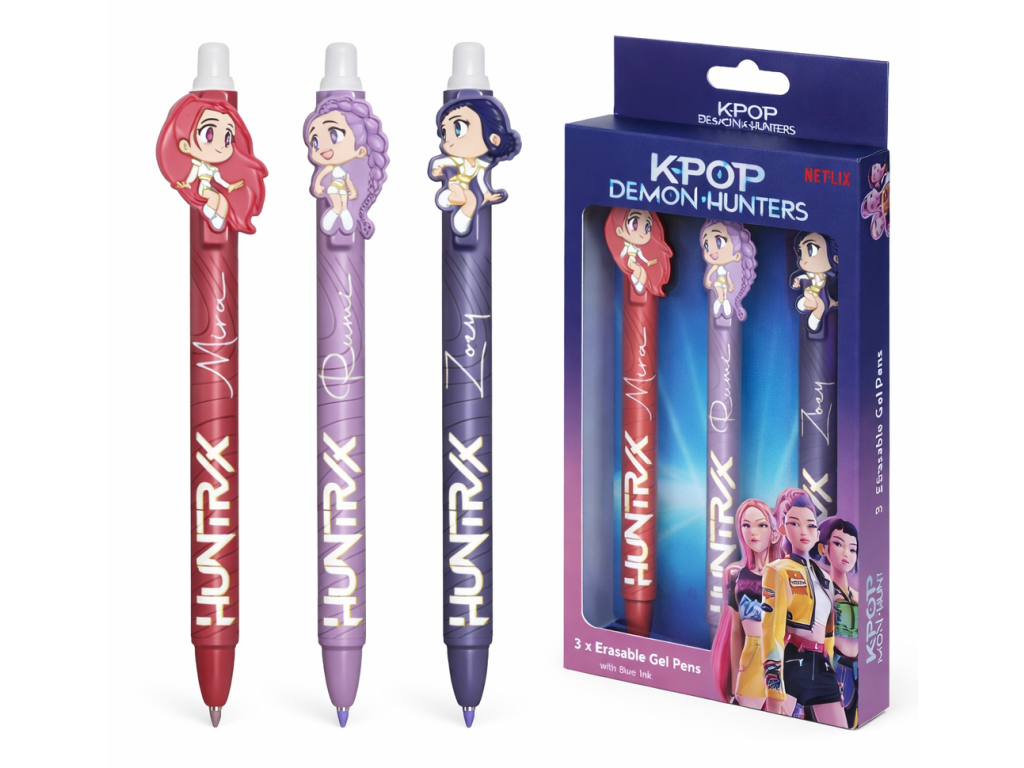 Set tří propisek s motivem hrdinek z KPop Demon Hunters. Každá z nich představuje jednu členku skupiny Huntrix – Miru, Rumi a Zoey – v chibi stylu. Skvěle píší, dají se mazat a díky originálnímu designu zaručeně vyniknou na každém stole.Doplňkové parametry