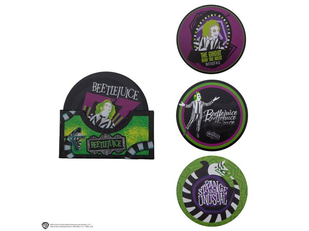 Vychutnejte si záhadné kouzlo Beetlejuice s naším setem 4 podtácků, z nichž každý má jedinečný design inspirovaný klíčovými prvky z filmu Beetlejuice. Tyto podtácky nejen chrání nábytek před nevzhlednými kruhy od vody, ale zároveň fungují jako zajímavý doplněk.