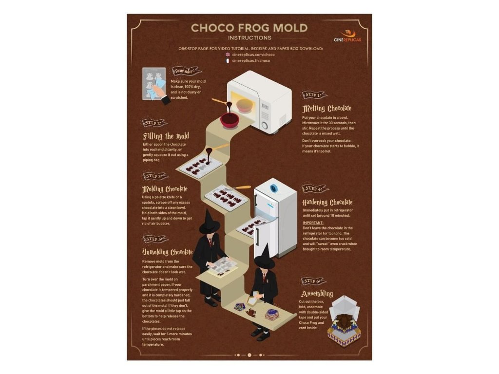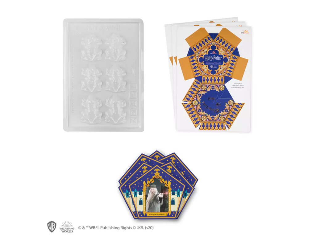 Sada obsahuje formu na pečení čokoládových žabek, 6 papírových krabiček a 12 kouzelnických karet.