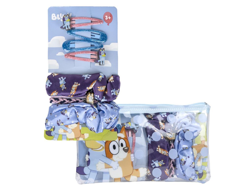 p>Stylová a veselá dětská sada doplňků s motivem Bluey, která obsahuje trojici praktických a hravých kousků: gumičky, náramek a sponky. Perfektní pro malé fanoušky, kteří chtějí mít svůj oblíbený motiv stále u sebe.- Obsah balení: gumičky do vlasů, náramek s motivem Bluey, sponky do vlasů