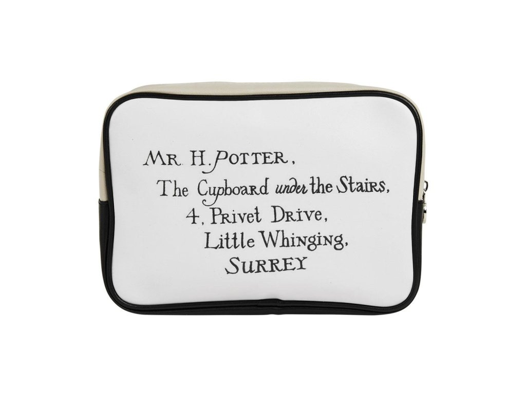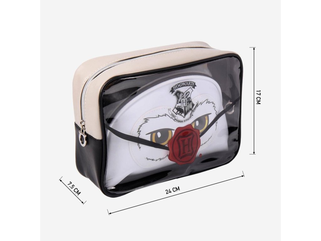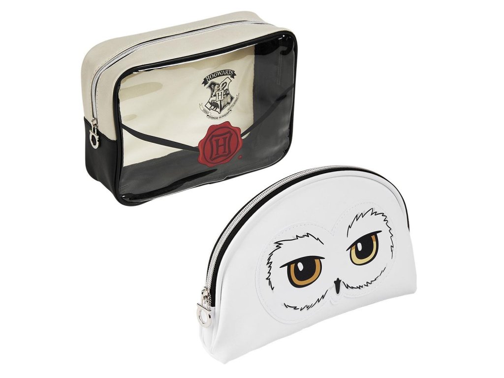 Sada obsahuje 2 kusy praktických kosmetických taštiček: větší s motivem dopisu do Bradavic a menší se sovou Hedvikou.