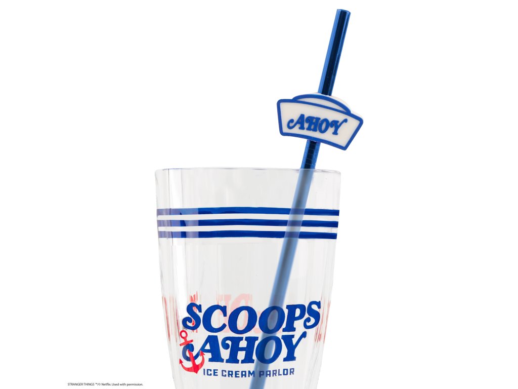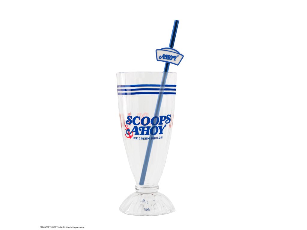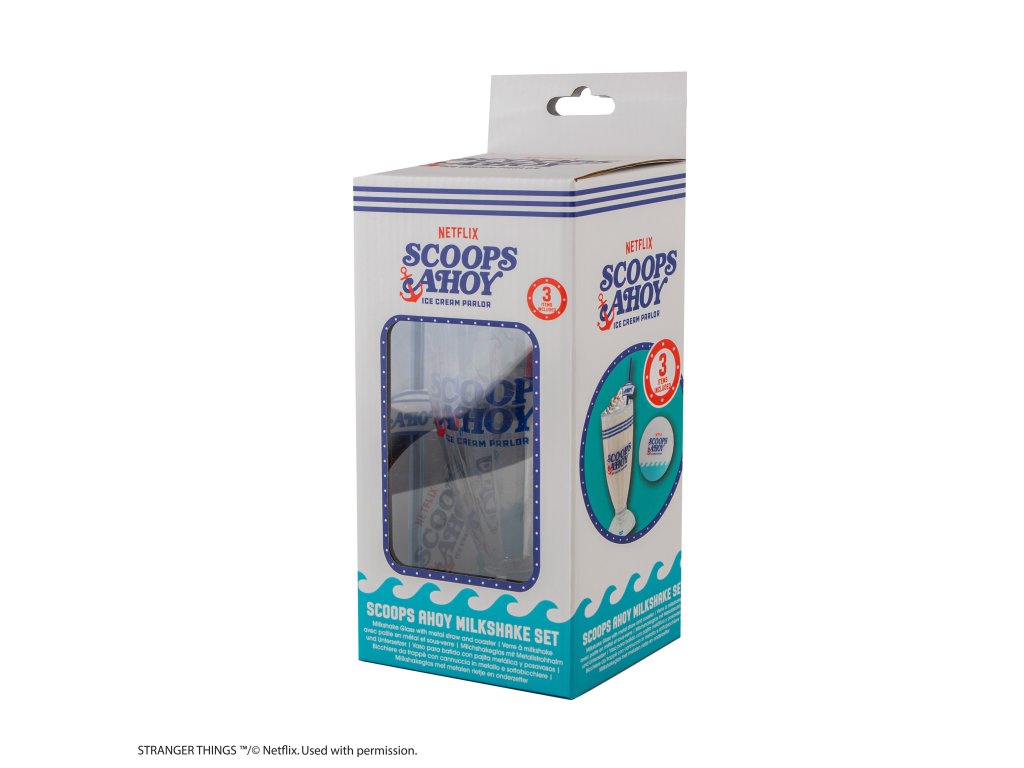Ponořte se do nostalgického kouzla Scoops Ahoy s naší výjimečnou sadou na mléčné koktejly, která je inspirovaná historickou zmrzlinárnou ze seriálu Stranger Things. Tato sada se vším všudy obsahuje klasickou sklenici na mléčný koktejl, kovové brčko a podtácek Scoops Ahoy a vytváří tak dokonalý nostalgický zážitek. Naše sklenice na mléčné koktejly je vyrobena v tradičním vysokém designu ve tvaru písmene Y se širokým hrdlem a snadno pojme velké porce mléčných koktejlů a požitkářských polev. Zdobí ji ikonické logo Scoops Ahoy a okamžitě vás přenese do světa seriálu Stranger Things.