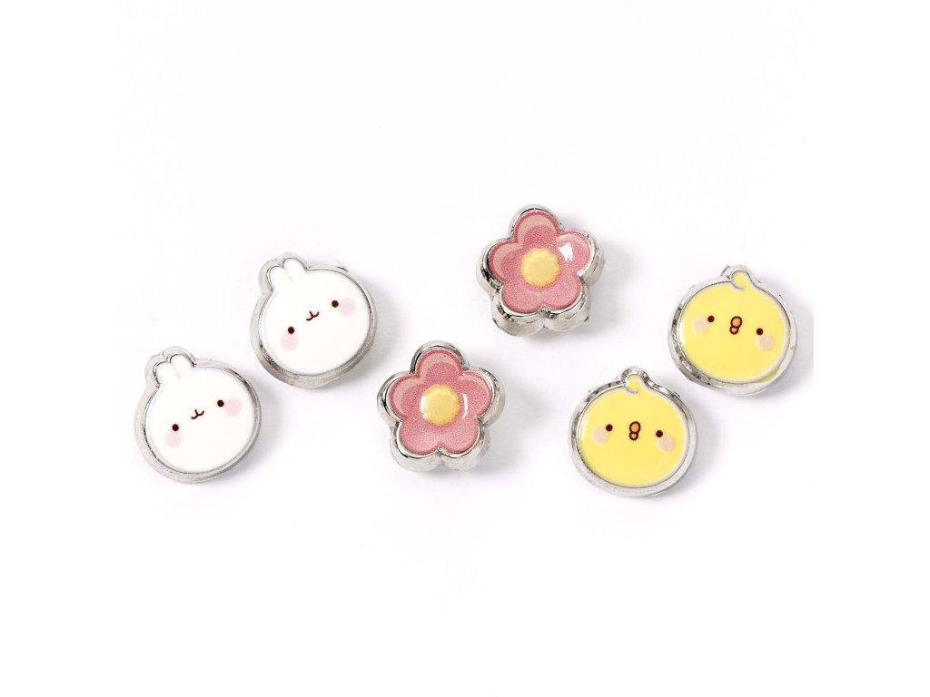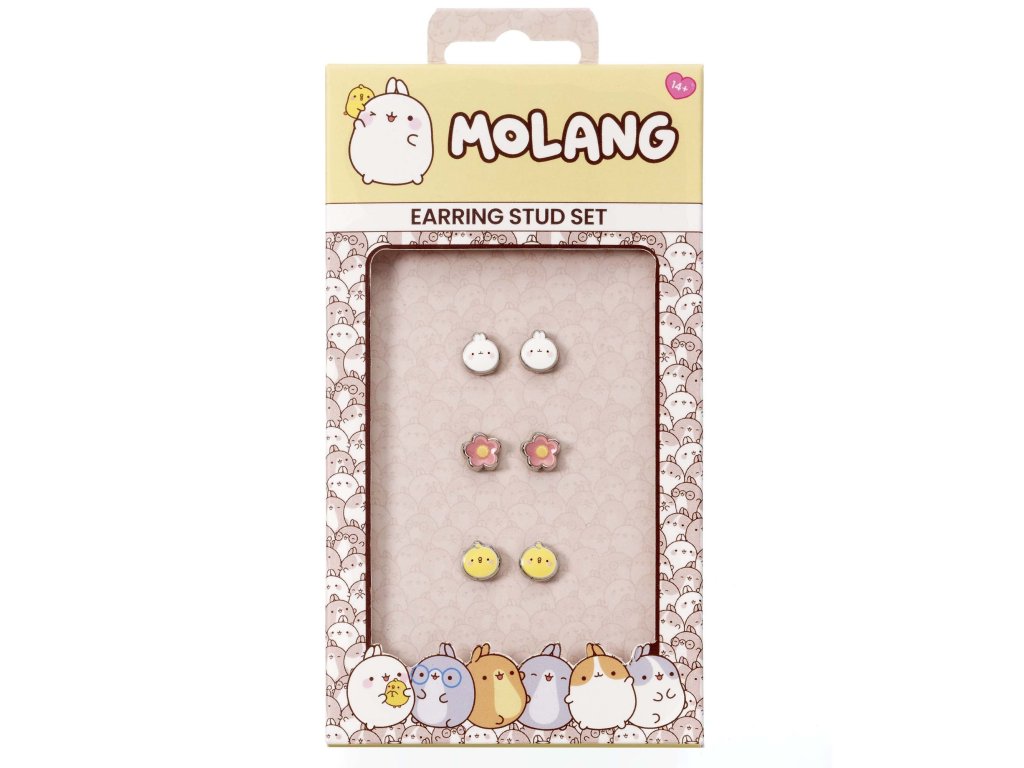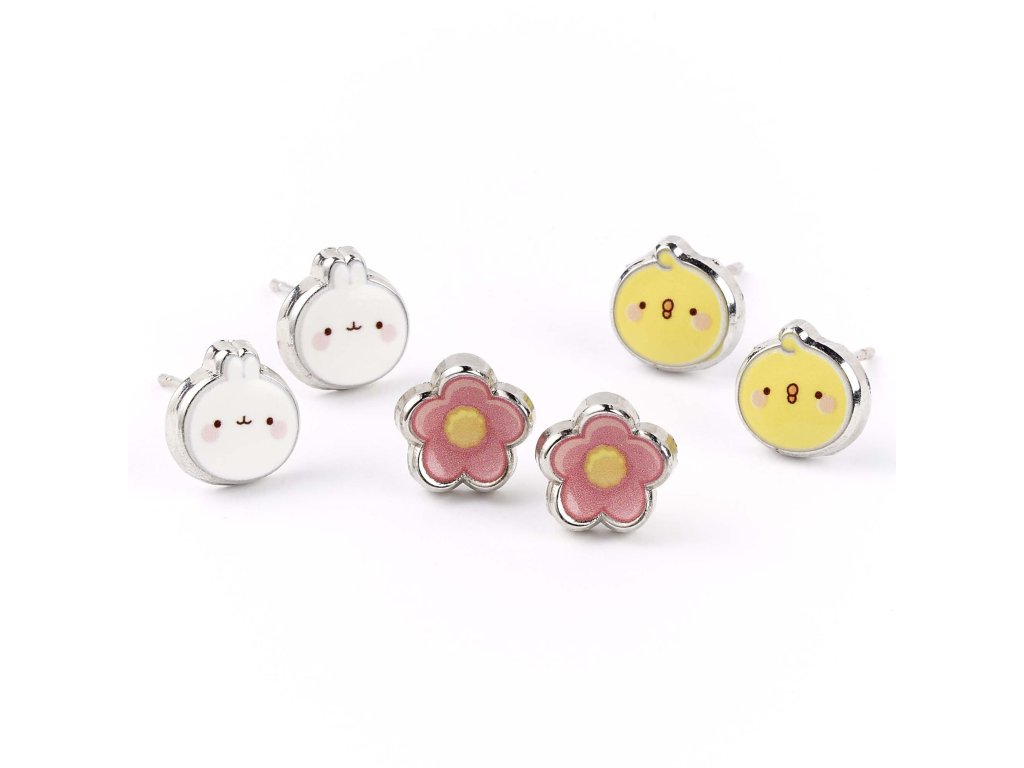 Roztomilé náušnice Molang a Piu Piu. Tato hravá kolekce obsahuje tři páry okouzlujících náušnicic: dva s motivem rozkošných postaviček Molang a Piu Piu a jeden s roztomilým květinovým vzorem. Tyto náušnice jsou vyrobeny bez olova, kadmia a niklu, takže jsou bezpečné a pohodlné pro každodenní nošení.