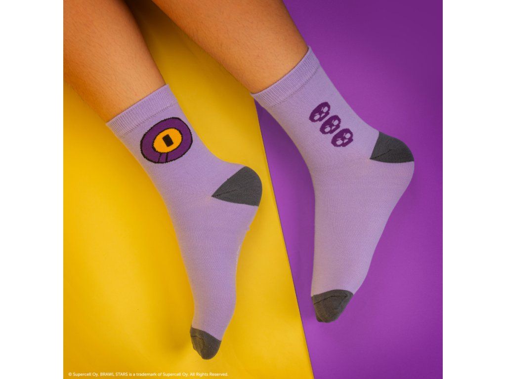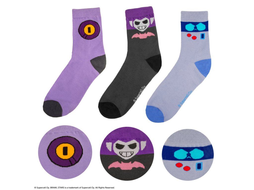 Set ponožek s motivem Brawl Stars potěší každého fanouška této oblíbené hry. Ponožky jsou vyrobeny z pohodlného, prodyšného materiálu, mají univerzální velikost a barevný design inspirovaný herními postavami. Jsou ideální na běžné nošení, do školy i jako originální dárek.Doplňkové parametry
