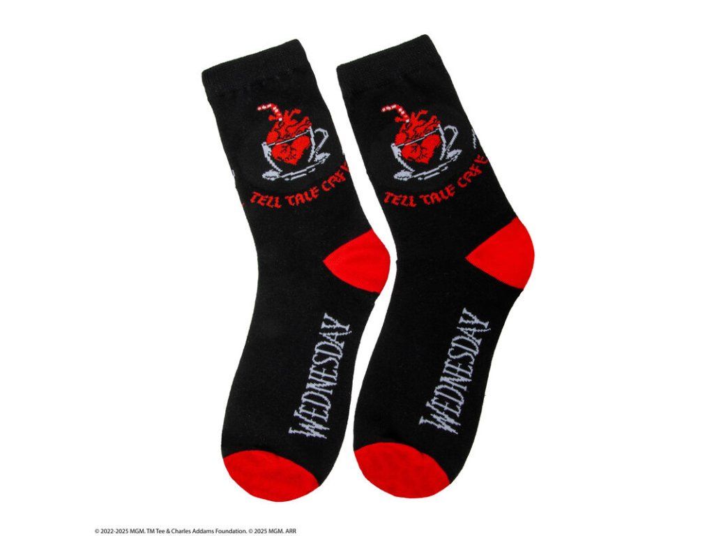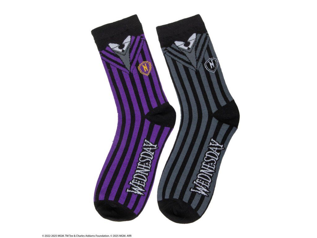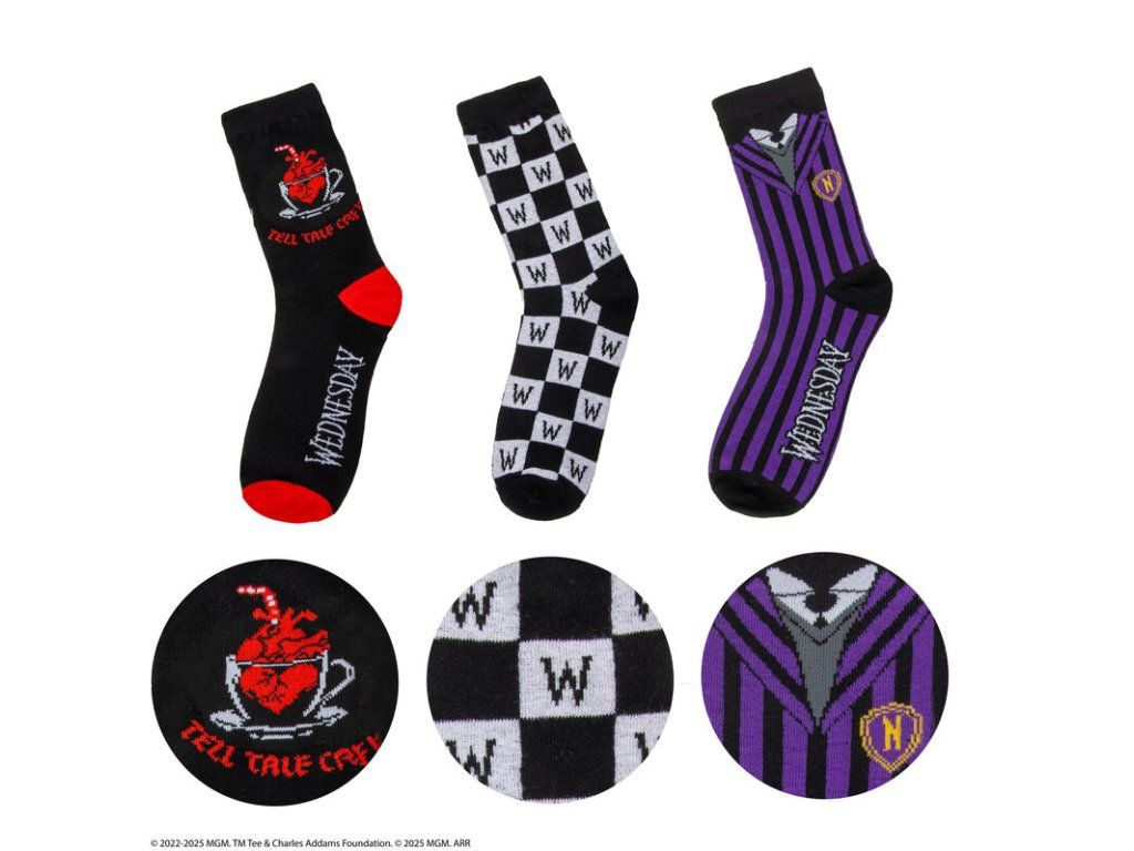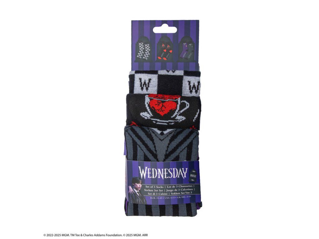 Stylová sada tří ponožek s motivem Wednesday je ideální volbou pro fanoušky temnější estetiky a ikonického seriálu. Každý pár má originální design inspirovaný postavou Wednesday Addams, takže si můžeš vybrat podle nálady, nebo je stylově kombinovat. Ponožky jsou vyrobené z příjemného a pružného materiálu, pohodlné na každodenní nošení doma, do školy i ven. Skvěle se hodí jako dárek pro všechny, kteří milují Wednesday a její nezaměnitelný styl.Doplňkové parametry
