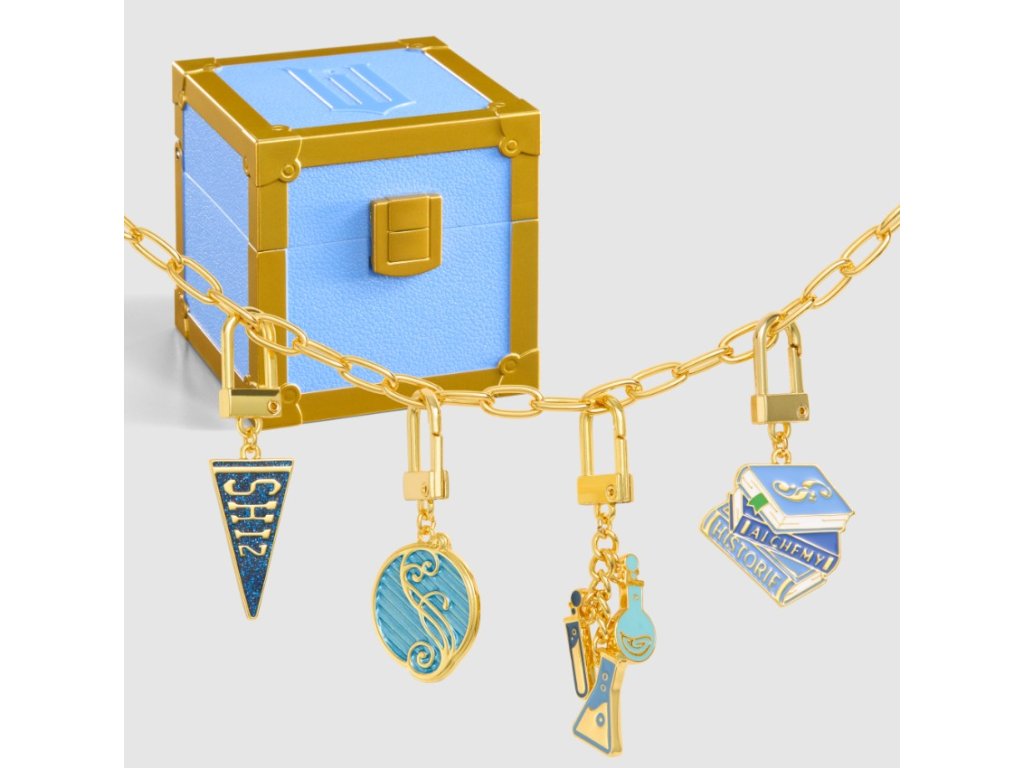 Modrá truhla Welcome to Shiz obsahuje 4 chytré a univerzitně inspirované přívěsky, které dodají kouzelný šmrnc tvé tašce, lahvi na vodu nebo jakémukoliv doplňku.