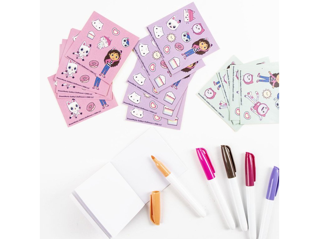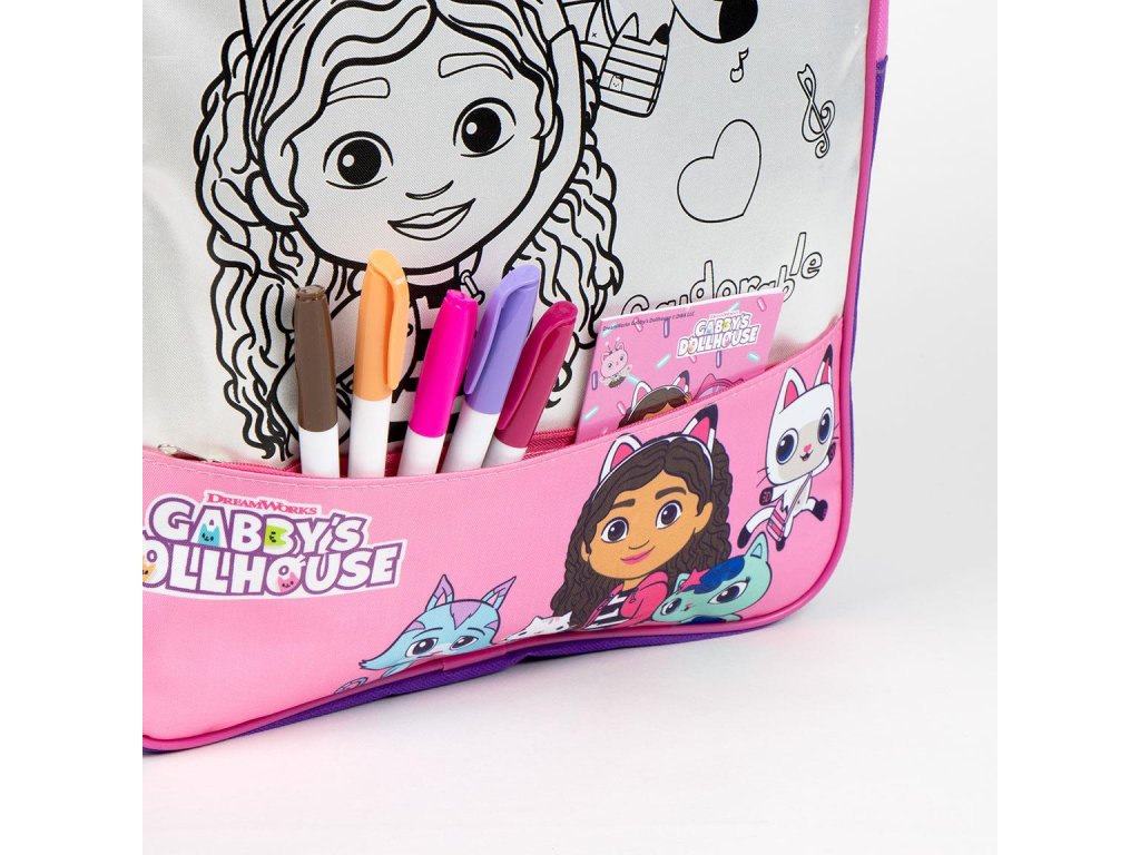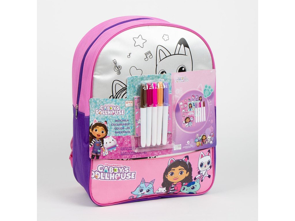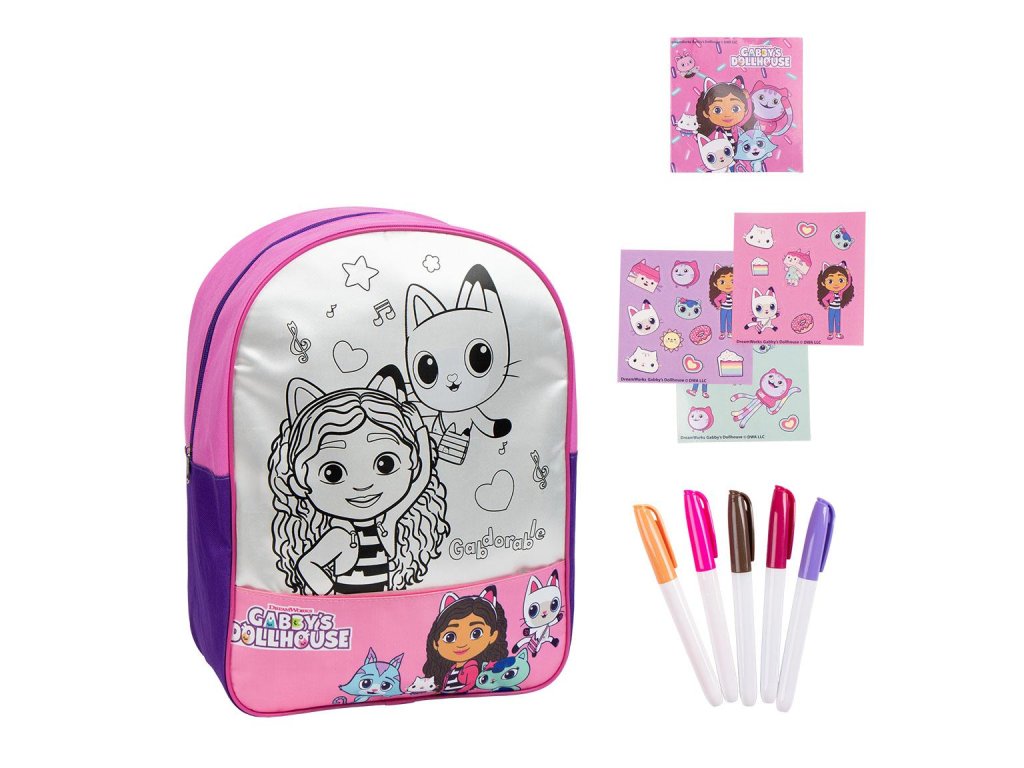 Sada pro dotvoření batohu s příslušenstvím z Gábinina kouzelného domku obsahuje batoh, který si děti mohou samy vymalovat podle své fantazie. Součástí sady jsou také fixy a samolepky, které umožňují kreativní zdobení a personalizaci batohu.