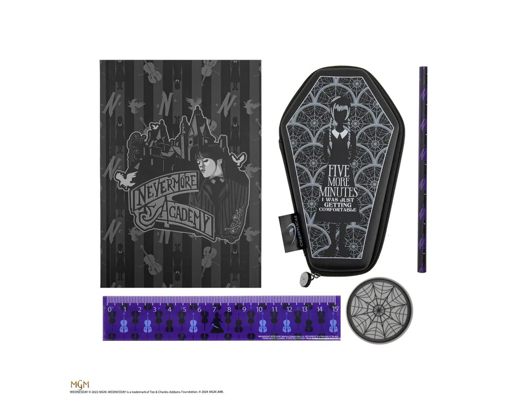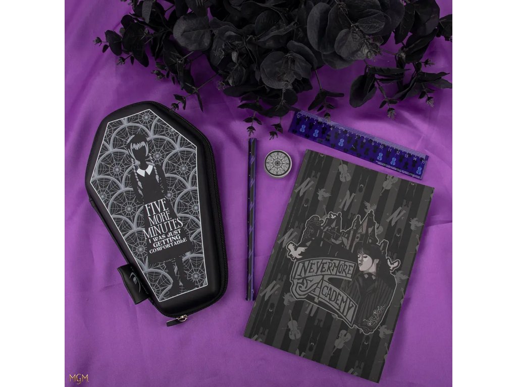 Povýšte své školní i tvůrčí potřeby na zcela novou úroveň s touto stylovou sadou psacích potřeb ve tvaru rakve, inspirovanou tajemným světem Wednesday Addams. Po otevření detailně zpracovaného penálu ve tvaru rakve vás uvítá temně elegantní obsah, který probudí vaši kreativitu: zápisník Nevermore Academy, pravítko, tužka, guma a rakvový penál. Ať už jste student, pisatel, nebo fanoušek temné estetiky, tahle sada je perfektní kombinací stylu, funkčnosti a gotické atmosféry. Vstupte do světa Nevermore s tužkou v ruce a temnotou v duši.Doplňkové parametry