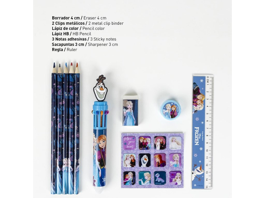 S touto sadou psacích potřeb s motivem Frozen se každý školní den stane pohádkovým zážitkem. Sada obsahuje vše, co malá školačka potřebuje – tužku, pravítko, struhadlo, gumu a další doplňky – a je zabalena v praktické taštičce s motivem Elsy a Anny.Doplňkové parametry