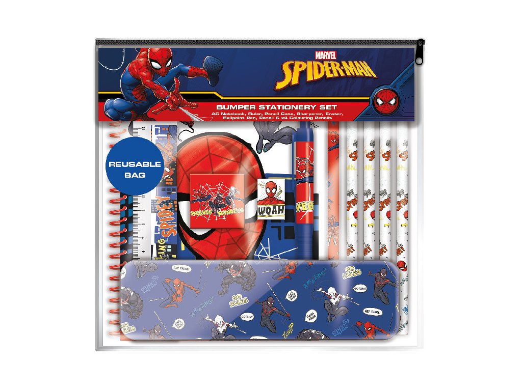 Praktické a kompaktní školní pomůcky s grafikou superhrdiny Spidermana, které budou užitečné v každodenním životě každého dítěte. Celá sada je zabalená v průhledné praktické tašce, která se dá dále využívat. Sada obsahuje: blok ve formátu A5, pravítko dlouhé 15 cm, kovový penál, 4 pastelky, gumu, kuličkové pero, tužku a ořezávátko.Doplňkové parametry