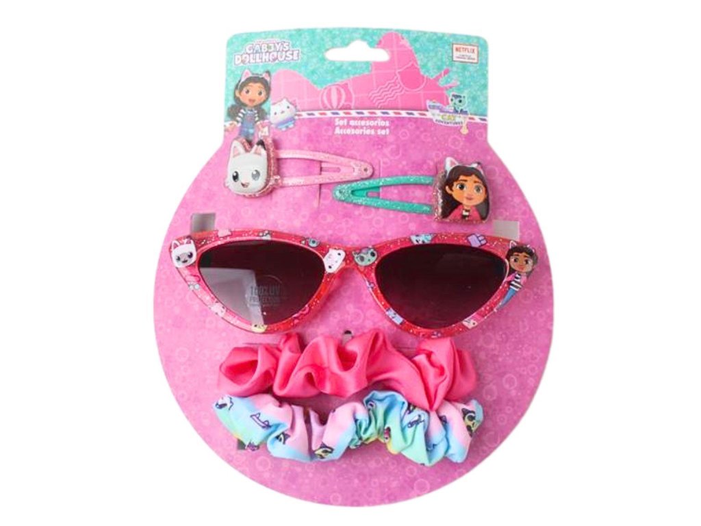 Barevná sada doplňků pro malé parádnice: sluneční brýle, gumičky do vlasů a sponky s oblíbenými postavičkami Gábi a kočiček.Doplňkové parametry