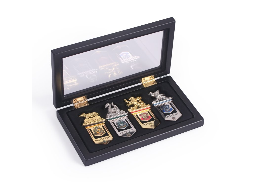S touto sadou postříbřených a 24karátově pozlacených záložek do knihy s motivem Harryho Pottera v černém pouzdře nikdy neztratíte, kde jste přestali číst. A také se nemusíte bát, že nebudete mít dostatek záložek pro hromady napůl přečtených knih – v sadě jsou čtyři záložky s motivem jedné z bradavických školních kolejí - Havraspár, Mrzimor, Nebelvír a Zmijozel.