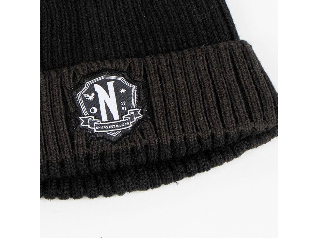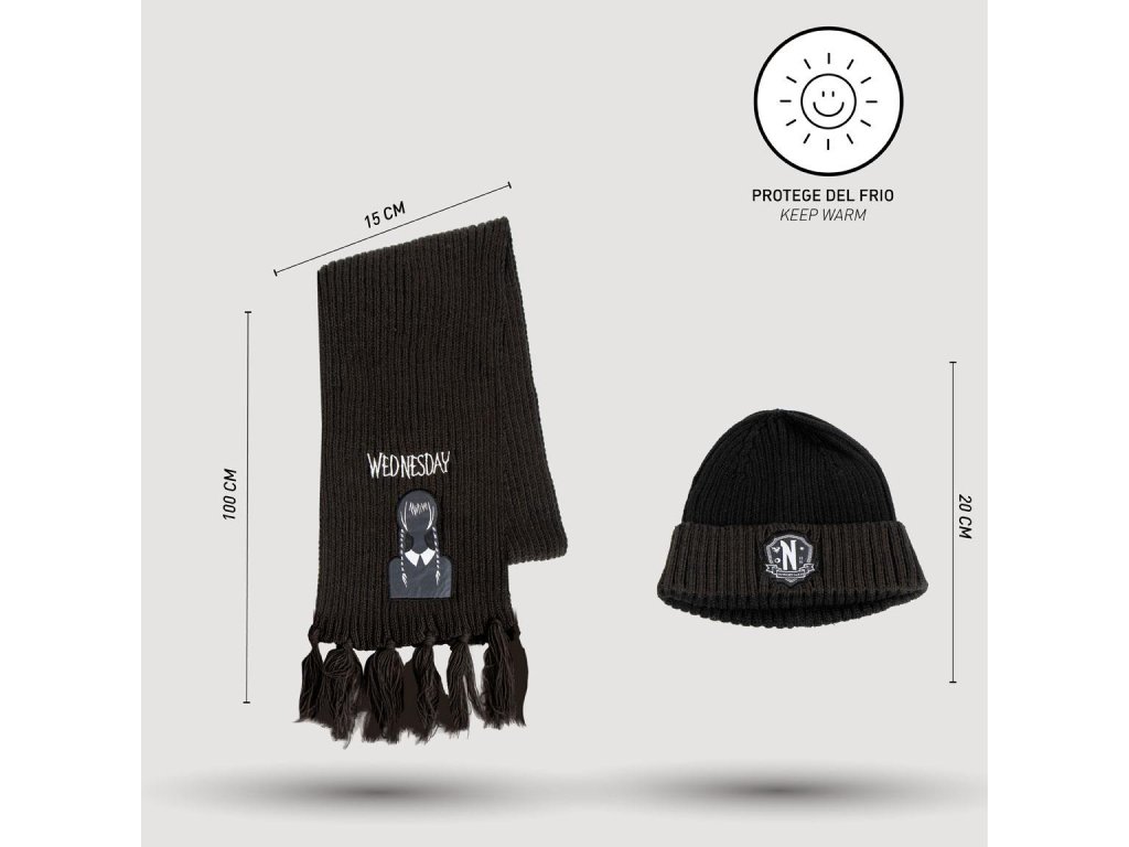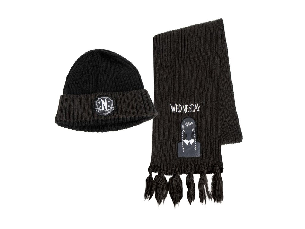 Tato elegantní černá sada s motivem Wednesday Addams potěší všechny fanoušky temnějšího stylu a oblíbeného seriálu. Stylová, teplá a dokonale ladící. Je ideální pro zimní dny.Doplňkové parametry