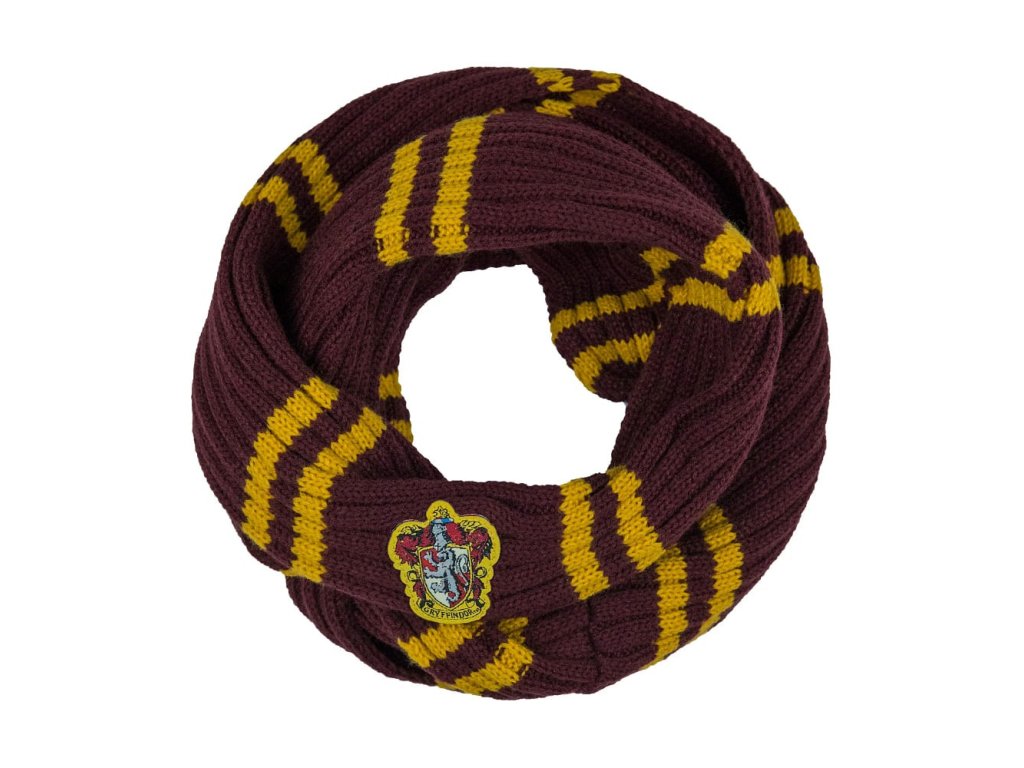 Stylová pruhovaná nekonečná šála ve stylu nebelvírské koleje ze školy čar a kouzel v Bradavicích.