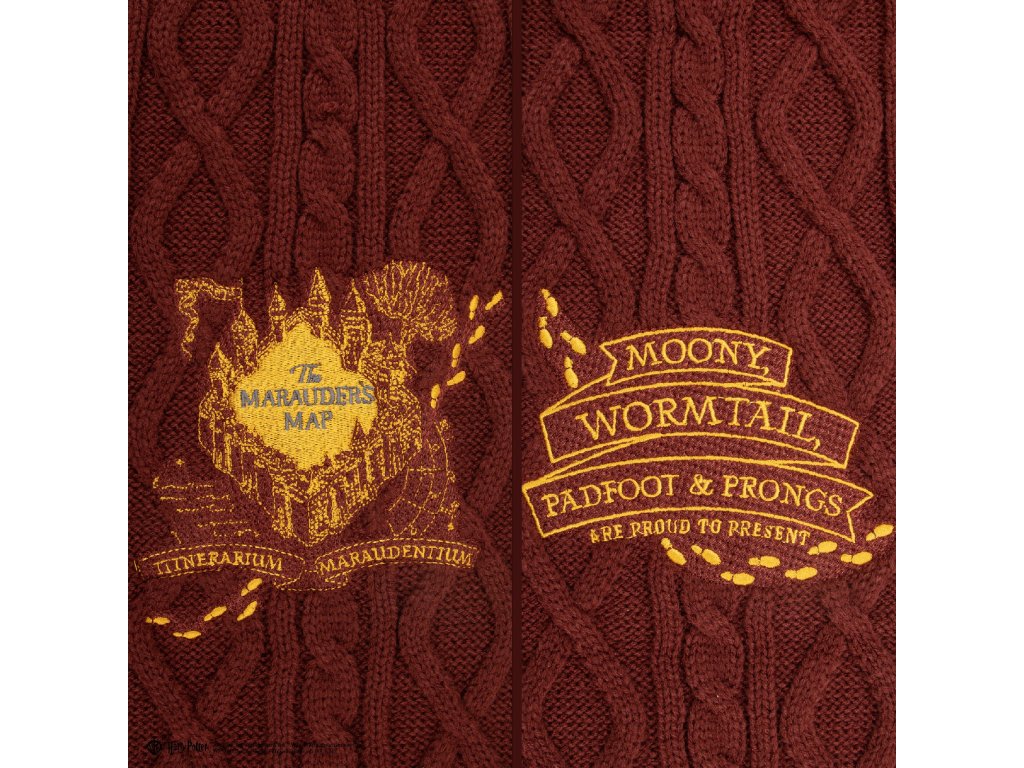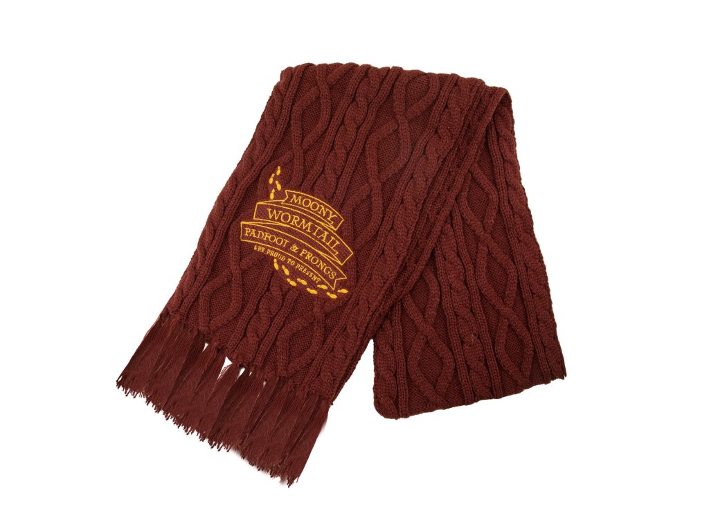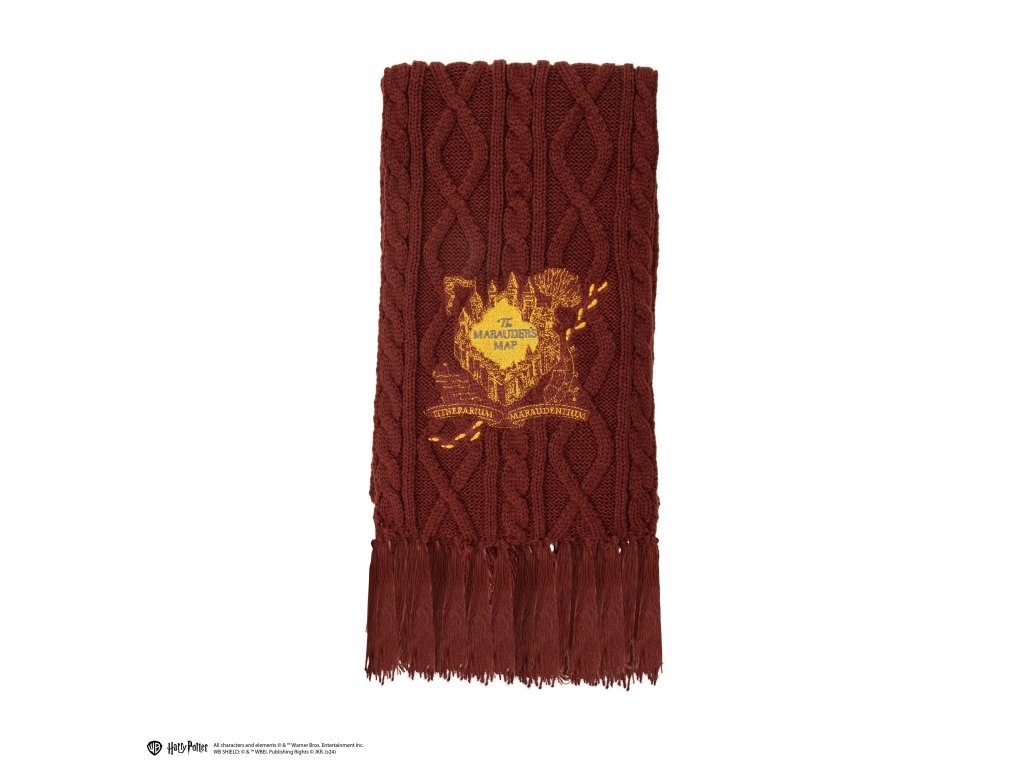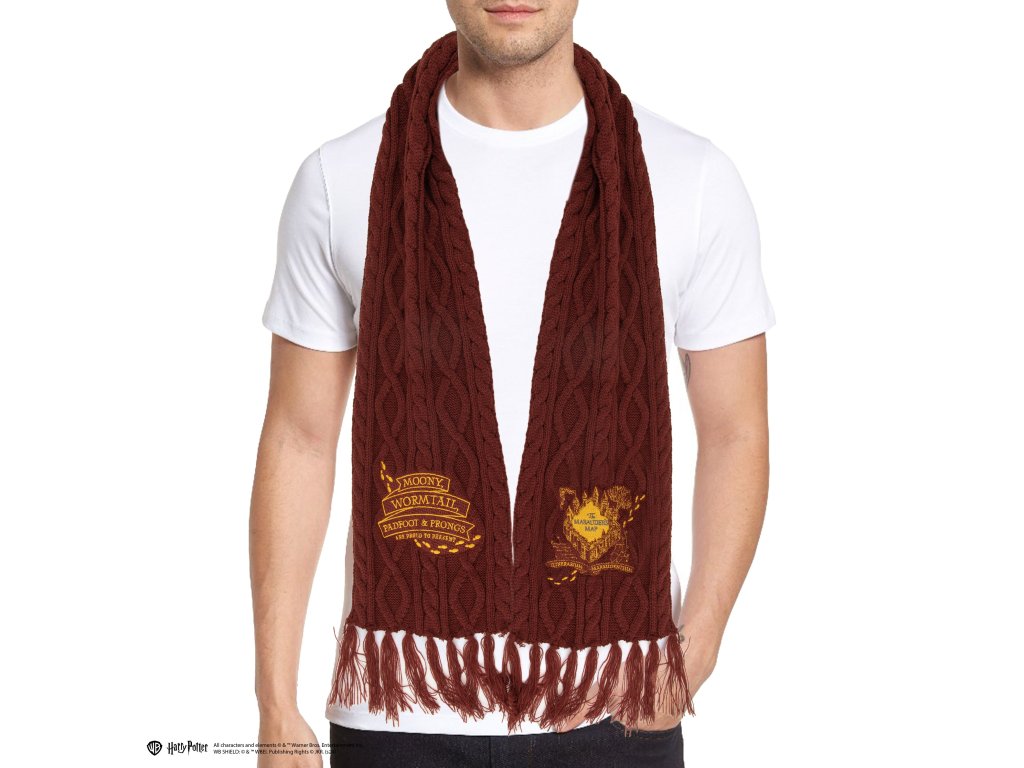 Dopřejte si kouzlo Harryho Pottera s nádhernou šálou v kaštanovém odstínu s designem Pobertova plánku. Na jednom konci se rozvine nezaměnitelný symbol plánku a na druhém konci je tučným písmem zobrazena fráze „Moony, Wormtail, Padfoot Prongs“.