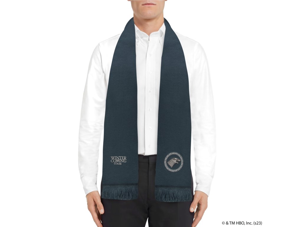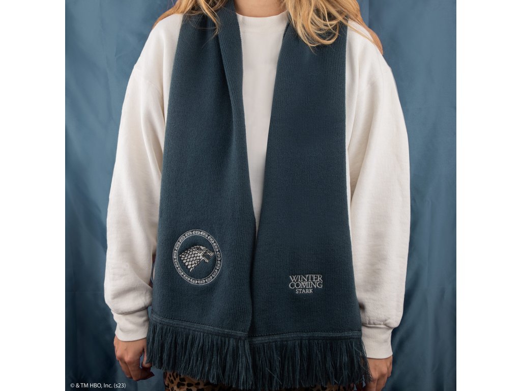 Inspirována ušlechtilým rodem Starků z Winterfellu, tato šála je dokonalým spojením stylu a věrnosti a je ideální doplněk do tvého zimního šatníku. Modrošedá šála nese na jednom konci ikonický znak Starků, šedého zlovlka, precizně vyšitý do látky, zatímco druhý konec hrdě zdobí slavné rodové heslo: „Zima přichází“. Přijmi ducha Severu a postav se blížící se zimě s odvahou, v šedé šále se zlovlkem.