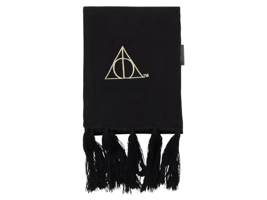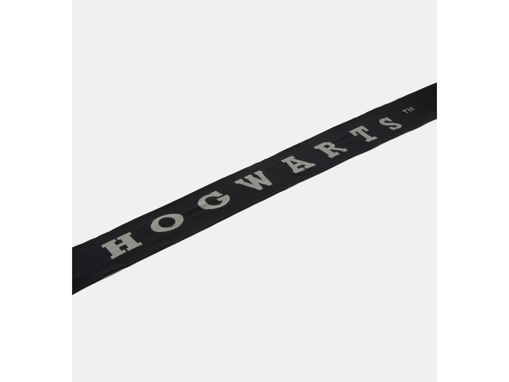 Černá šála s nápisem Hogwarts (Bradavice) a symbolem Relikvií smrti. Oficiální licencovaný produkt.