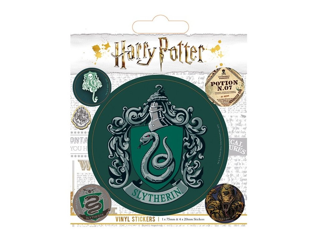 Balení pěti kusů samolepek s logem a grafikou zmijozelské koleje, známé z filmové ságy Harry Potter.
