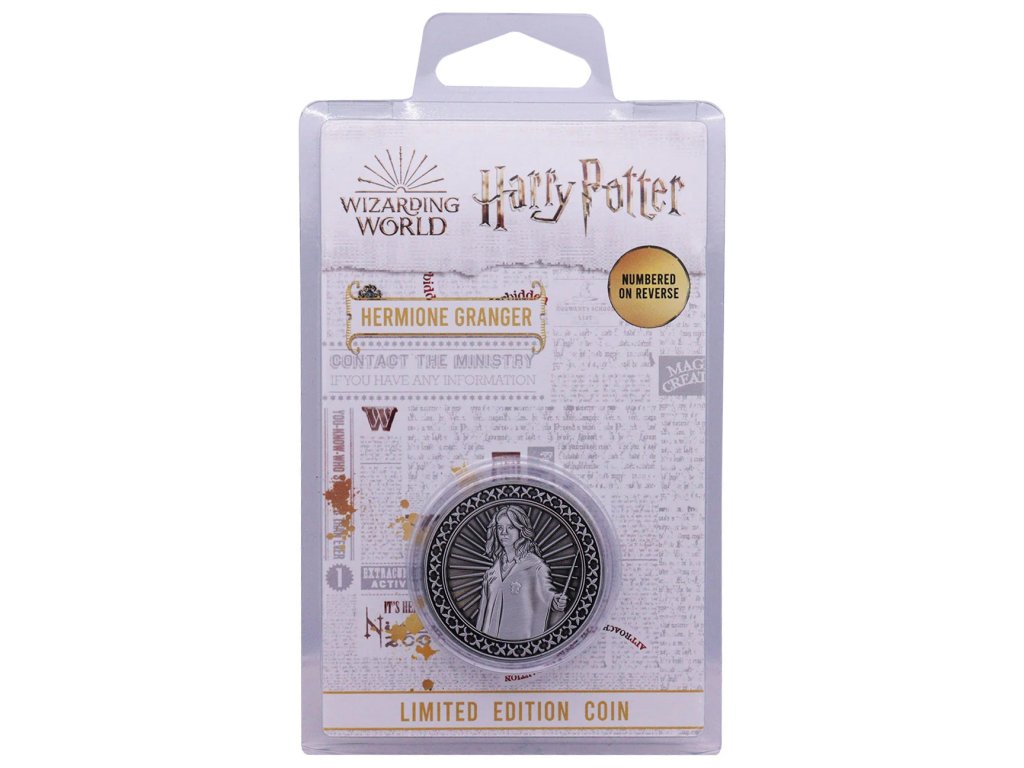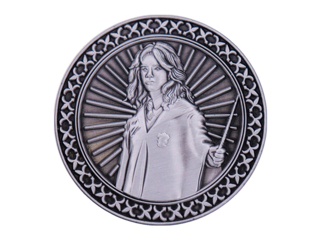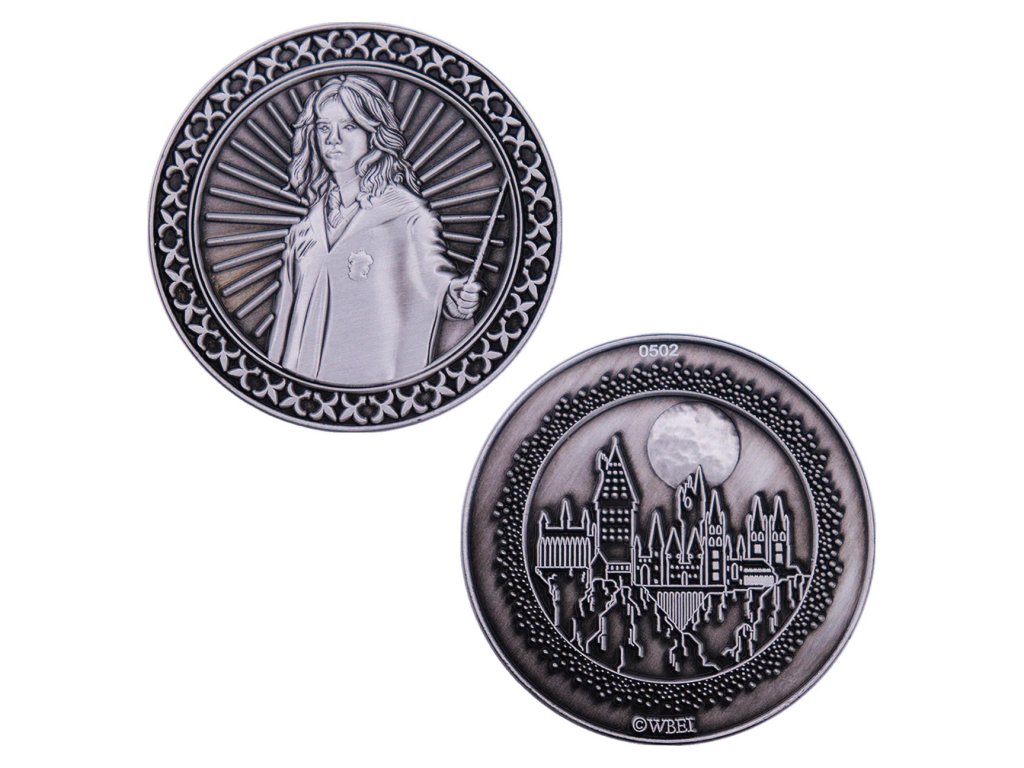 Sběratelská mince ve stříbrné barvě, na které je vyobrazen Hermiona Grangerová, z druhé strany je pak k vidění Škola čar a kouzel v Bradavicích.