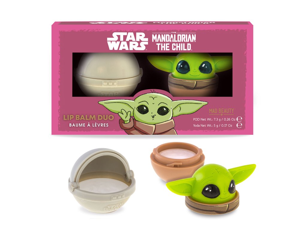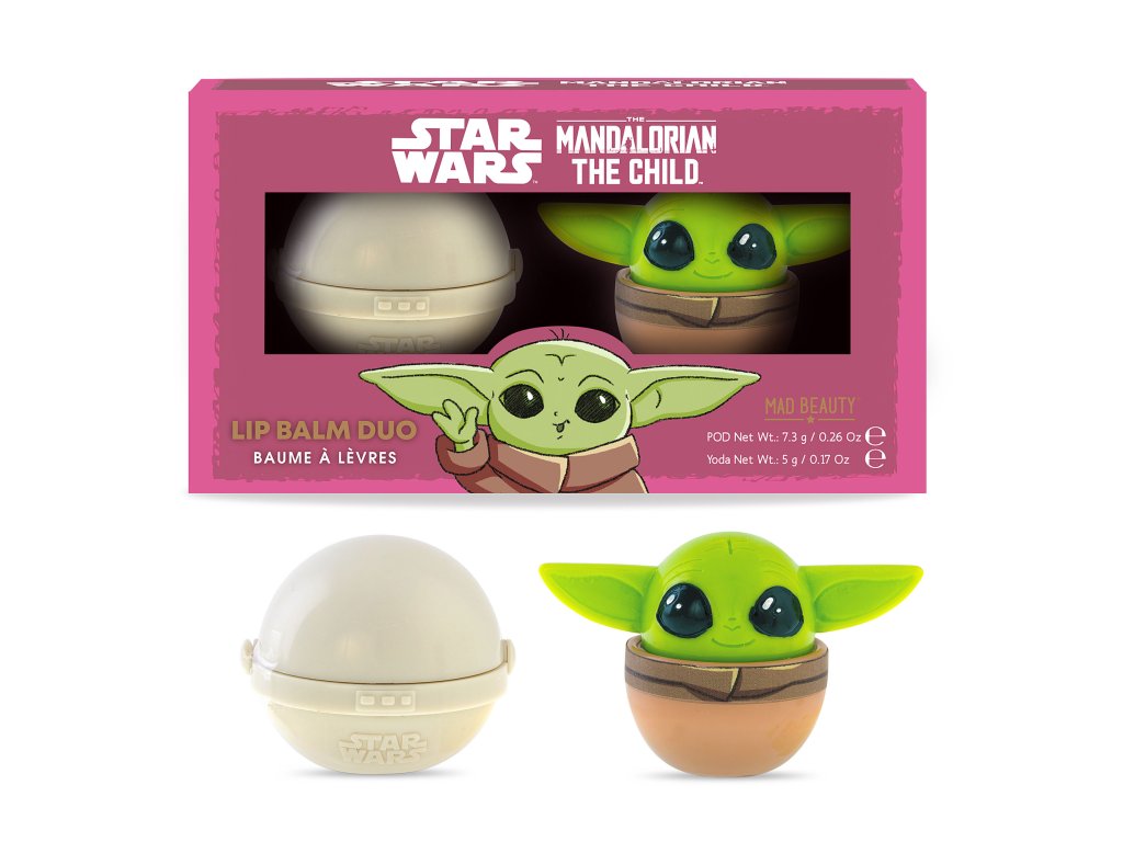Set péče na rty, Star Wars Grogu/Mandalorian The Child, vůně: jablko a třešeň. Obsah: POD balzám na rty v kelímku 7,3 g, Yoda balzám na rty v kelímku 5 g. Zanechává rty hebké a jemné, poskytuje suchým rtům okamžitou úlevu, jemně rty tónuje. Naneste na rty kdykoli během dne dle potřeby.