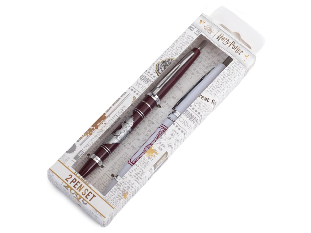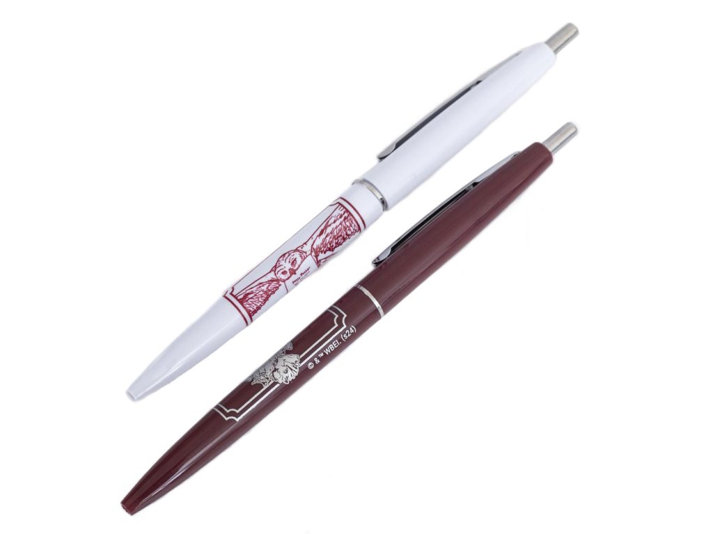Sada dvou barevných kuličkových per se saténovým povrchem, na kterých je vyobrazena sova Hedvika doručující dopis. Barva náplní je černá.