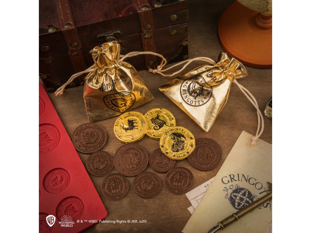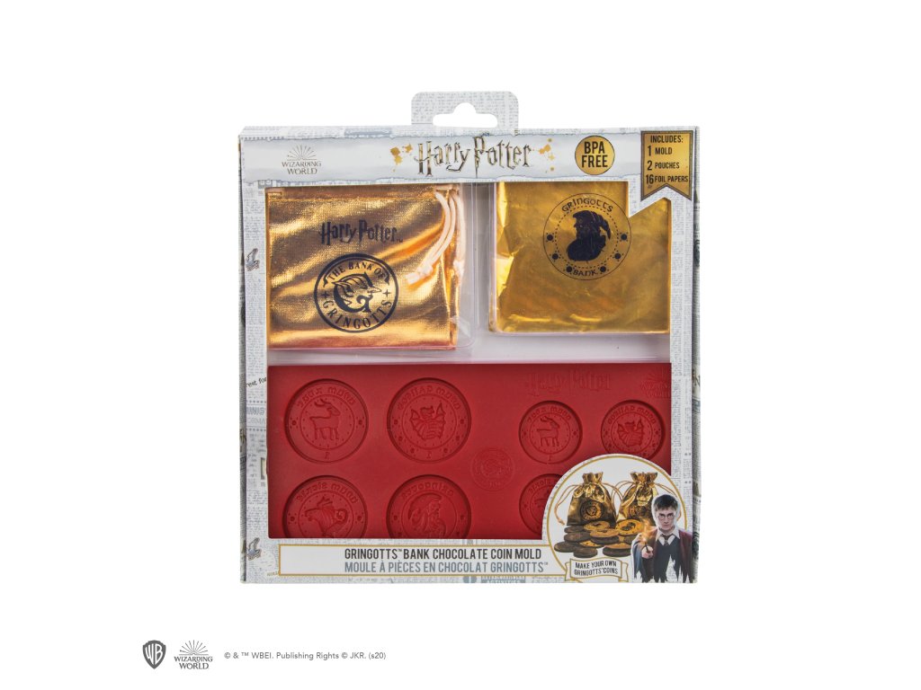 Vytvořte si vlastní čokoládové galeony, knuty a srpy pomocí této silikonové formy. Za čokoládové repliky Gringottových peněz si sice nic nekoupíte, ale budou více než chutné! Vyrobte si mince, naplňte si kapsy, zbohatněte, ale hlavně si pochutnejte na dobrotách!