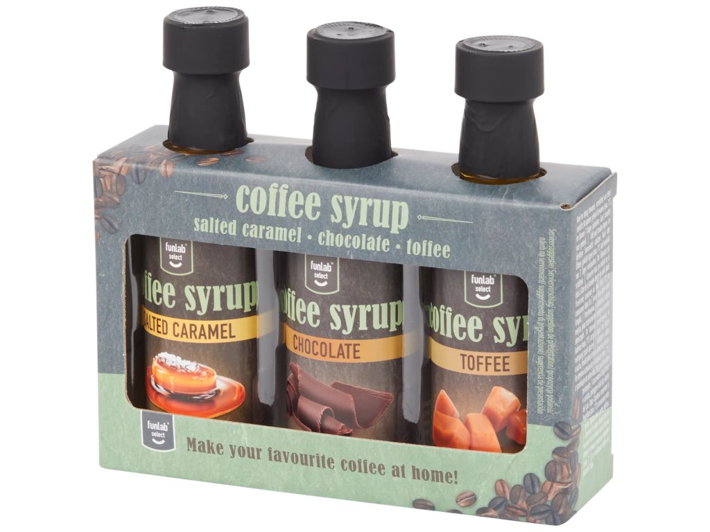 Set tří sirupů do kávy v dárkovém balení. Příchutě: slaný karamel, čokoláda, toffee.