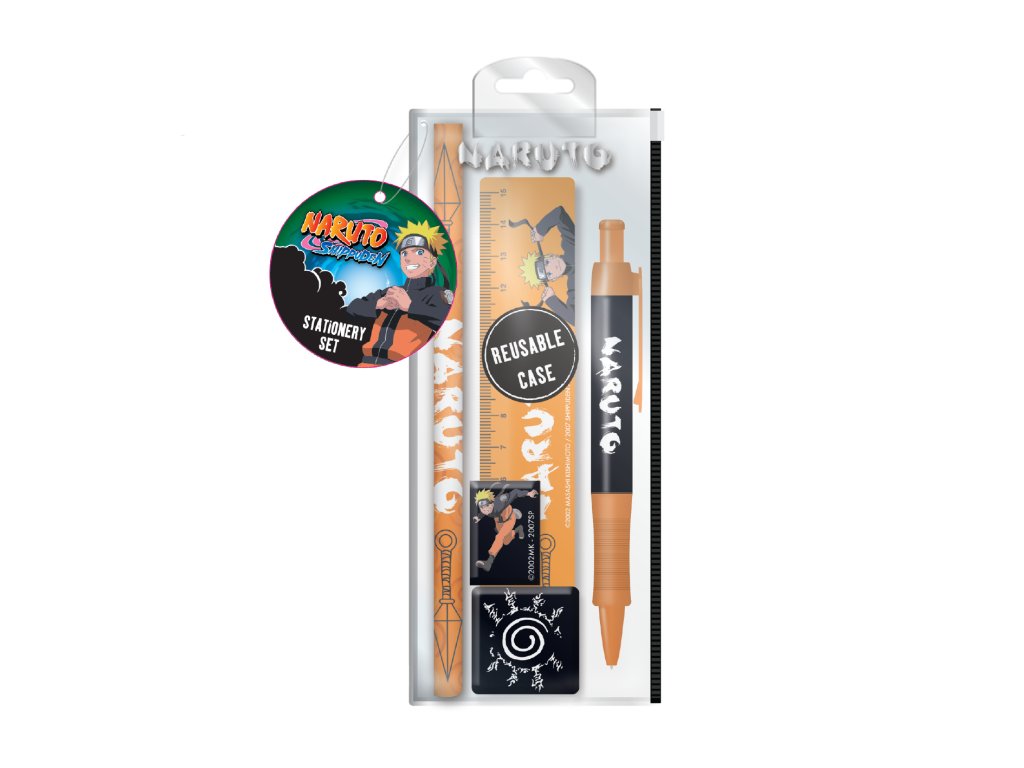 Set Naruto obsahuje pravítko, gumu, ořezávátko, pero a tužku.Doplňkové parametry